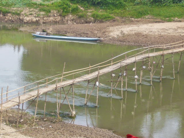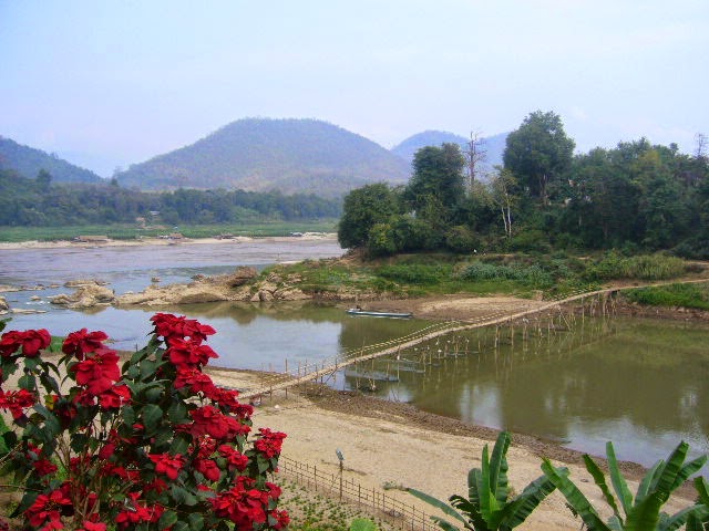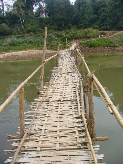 Primero, vamos por la calle que da al rio, y paramos en un pequeño parque, desde donde se ve el rio Mekong, unos pueblecitos al otro lado del rio, y unos puentes de bambu, que cruzan el rio Nam Khan, y conducen a un templo entre los arboles.