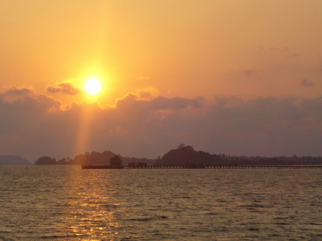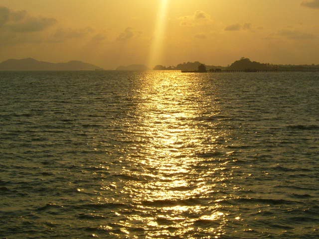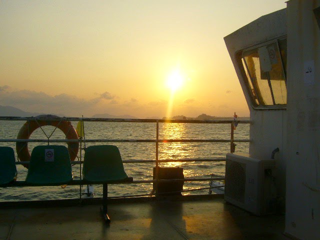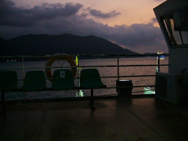 El viaje hacia la isla es precioso. El sol se esta ocultando por detras de la isla, y un reflejo rojizo se extiende por el agua. Me coloco en proa, y disfruto de la brisa y de la vista.