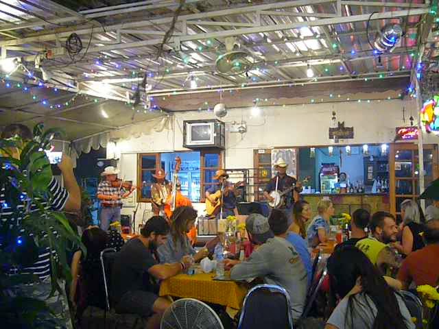 Llegamos al hostal ( Jaidii House ) y se nos caen los palos del sombrajo.Ya hemos pagado, y la habitacion esta en planta baja, con una ventana que da a un pequeño jardin con mesas, donde se estan tomando unas cervezas.